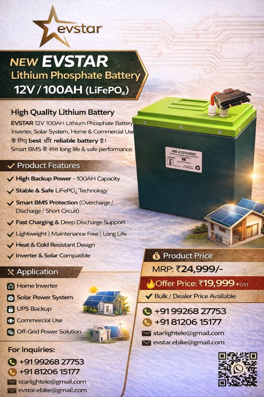 NEW EVSTAR Lithium Phosphate Battery 12V/100AH (LiFePO4